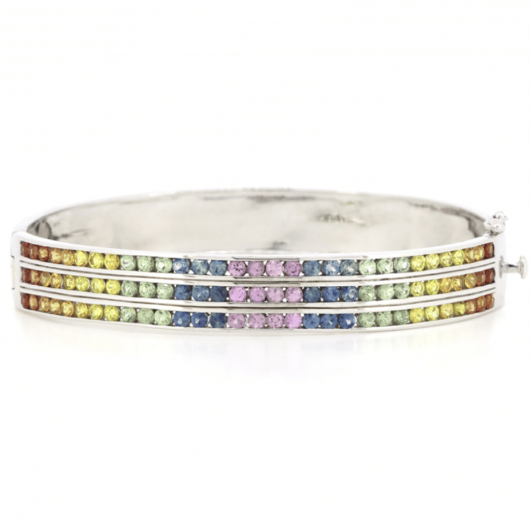 14K WHITE GOLD, MULTI-COLOURED SAPPHIRE, BANGLE. The Design Features, 94 Round Cut, Blue, Yellow, Orange, Pink, Reddish Orange And Greyish Green, Sapphires (5.41Ct Tsw, Minor Eye Inclusions), Channel Set In Triple Rows. The Bangle Comes With A Box Clasp Closure And A Figure 8 Safety Catch. The Bangle Measures 6.01 Cm. Valuations Provided by an Independent Third-Party Professional Not Directly Associated With Lloyds Auctions at AUD $$36,000.00This valuation has been conducted by an independent third-party professional. The valuation amount is an assessment by the issuing valuer and does not reflect the auction value of the item. Any inquiries regarding the valuation should be directed to the issuing valuer (refer to contact details on the certificate), as Lloyds Auctions has no affiliation or influence over the valuation, the valuer, or the stated amount. Condition: Good - Refer Images 0645832+5267