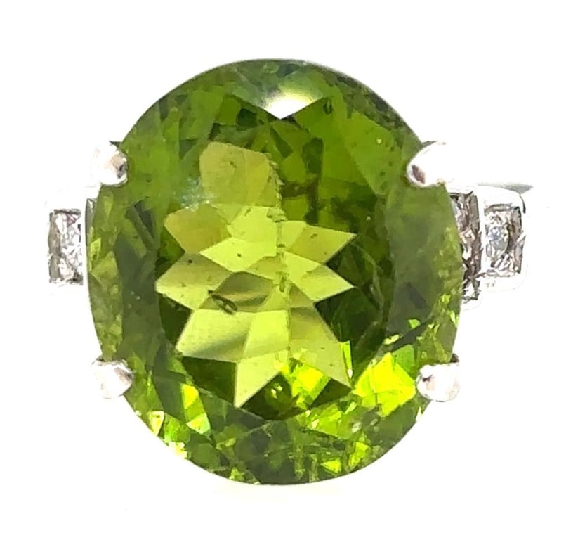 This 18Ct White Gold Ring Features 1 X 10.55Ct Oval Cut Claw Set Peridot Measuring 14.4 X 12.6Mm & Deep Green In Colour With 6 X Round Brilliant Cut Claw Set Diamonds Set In The Shoulders Of The Ring, Tcw: 0.15, Clarity: Si, Colour: F.