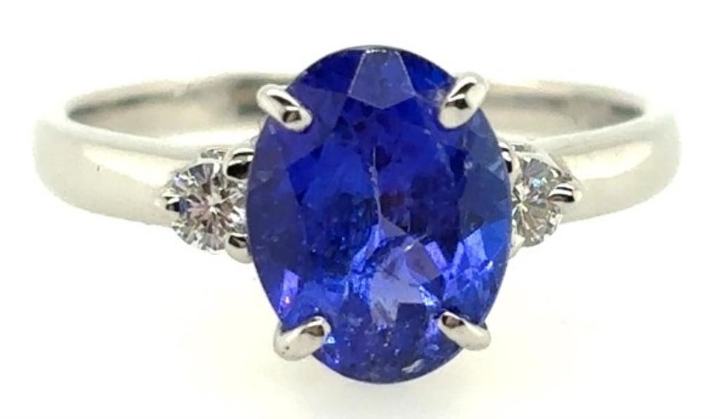 Featuring Oval Cut Tanzanite, Claw Set, 2.10Ct In Weight (9.0 X 6.9 Mm), Vivid Violet Blue In Colour. 2 Round Brilliant Cut Diamonds, Claw Set, 0.08Ct In Total Combined Weight, P1 In Clarity And H In Colour. Finger Size K 2.