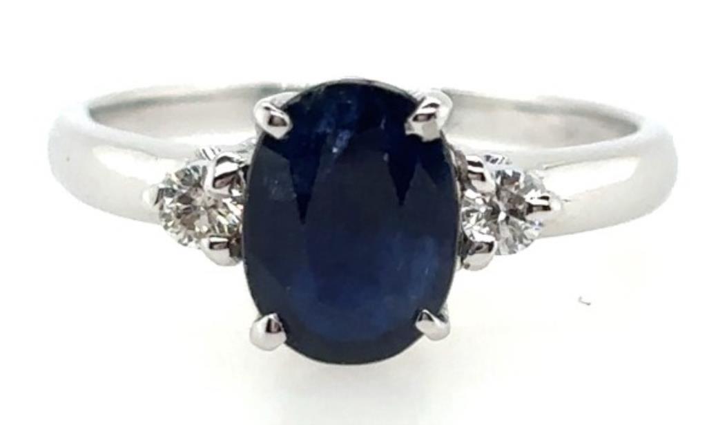 Featuring Centre Oval Cut Australian Sapphire, 1.40Ct In Weight (8.0 X 5.8 Mm) And Deep Blue In Colour. 2 Round Brilliant Cut Diamonds, Set On Sides Of Centre Stone, 0.06Ct In Total Combined Weight, Si In Clarity And G/H In Colour. Finger Size L.
