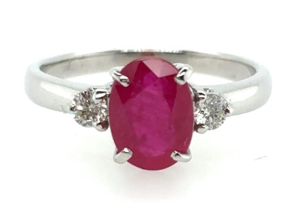 Featuring Oval Cut Ruby, Claw Set, 1.46Ct In Weight (8.0 X 5.9 Mm), Pinkish Red In Colour. 2 Round Brilliant Cut Diamonds, Claw Set, 0.08Ct In Total Combined Weight, Si In Clarity And G In Colour. Finger Size K.