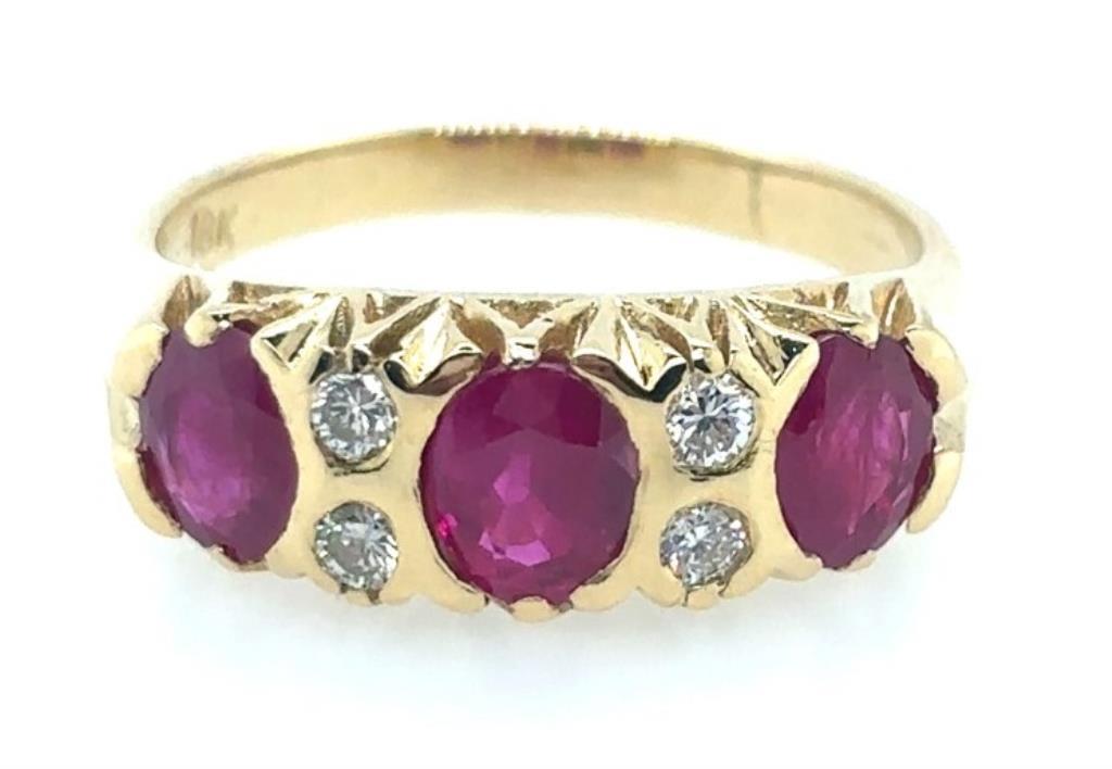 This Victorian Era Style Ring Features 3 Oval Cut Rubies, Semi-Bezel Set, 2.08Ct In Total Combined Weight, Red In Colour. 4 Round Brilliant Cut Diamonds, Set Around Centre Stones, 0.12Ct In Total Combined Weight, Si In Clarity And H In Colour. Finger Size O1/2.