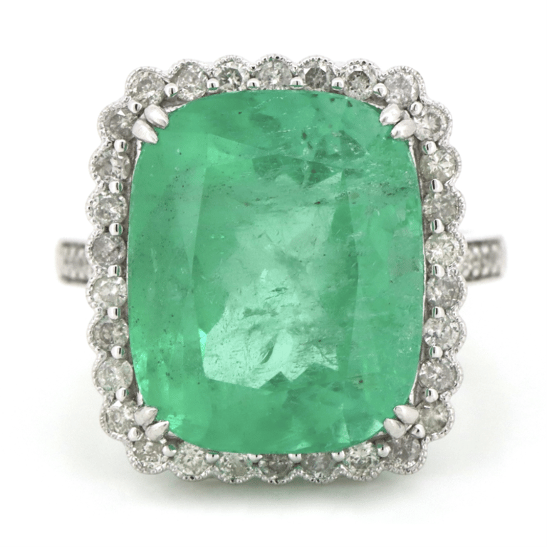 The Centre Features, One Emerald Cut, Moderate-Strong Green, Colombian Emerald (12.59Ct, Moderately Naturally Included-Clarity), 4 Double Claw Set. Surrounding The Centre In A Halo And Decorating The Band Are, 44 Round Brilliant Cut, Diamonds (0.59Ct Tdw, G-H Colour, Si1-Si2 Clarity), Claw Set. Ring Size M.