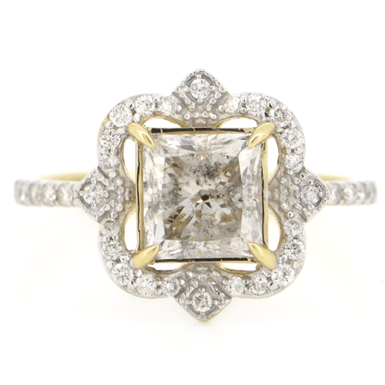 14K YELLOW GOLD AND DIAMOND, ANTIQUE INSPIRED RING. The Centre Features, One Square Princess Cut, Diamond (1.80Ct, I-J Colour, P2+ Clarity), 4 Claw Set. Surrounding The Centre In A Decorative Halo And Decorating The Band Are, 42 Round Brilliant Cut, Diamonds (0.28Ct Tdw, G-H Colour, Si1-Si2 Clarity), Micro-Bead Set. Ring Size N. Valuations Provided by an Independent Third-Party Professional Not Directly Associated With Lloyds Auctions at AUD $$32,000.00This valuation has been conducted by an independent third-party professional. The valuation amount is an assessment by the issuing valuer and does not reflect the auction value of the item. Any inquiries regarding the valuation should be directed to the issuing valuer (refer to contact details on the certificate), as Lloyds Auctions has no affiliation or influence over the valuation, the valuer, or the stated amount. Condition: Good - Refer Images 0645844+5045
