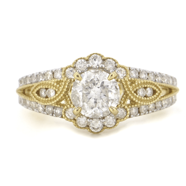 14K YELLOW GOLD AND DIAMOND, HALO FILIGREE RING.