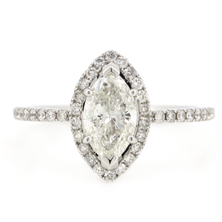 The Centre Features, One Marquise Brilliant Cut, Diamond (0.90Ct, G-H Colour, I1 Clarity), Claw Set. Surrounding The Centre In A Halo And Decorating The Band Are, 40 Round Brilliant Cut, Diamonds (0.31Ct Tdw, H-I Colour, Si-I1 Clarity), Claw Set. Ring Size N 1/2.