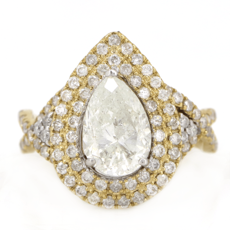 14K YELLOW/WHITE GOLD AND DIAMOND, DOUBLE HALO TWIST BAND RING. The Centre Features, One Pear Modified Brilliant Cut, Diamond (2.01Ct, G-H Colour, P2-P3 Clarity), 3 Claw Set. Surrounding The Centre In A Halo Are, 88 Round Brilliant Cut, Diamonds (0.75Ct Tdw, H-K Colour, P2+ Clarity), Bead Set. Ring Size M 1/2. Valuations Provided by an Independent Third-Party Professional Not Directly Associated With Lloyds Auctions at AUD $$57,300.00This valuation has been conducted by an independent third-party professional. The valuation amount is an assessment by the issuing valuer and does not reflect the auction value of the item. Any inquiries regarding the valuation should be directed to the issuing valuer (refer to contact details on the certificate), as Lloyds Auctions has no affiliation or influence over the valuation, the valuer, or the stated amount. Condition: Good - Refer Images 0645844+5091
