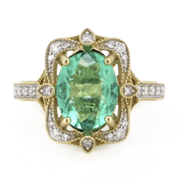 14K YELLOW GOLD, 2.24CT COLOMBIAN EMERALD AND DIAMOND, ANTIQUE INSPIRED RING.
