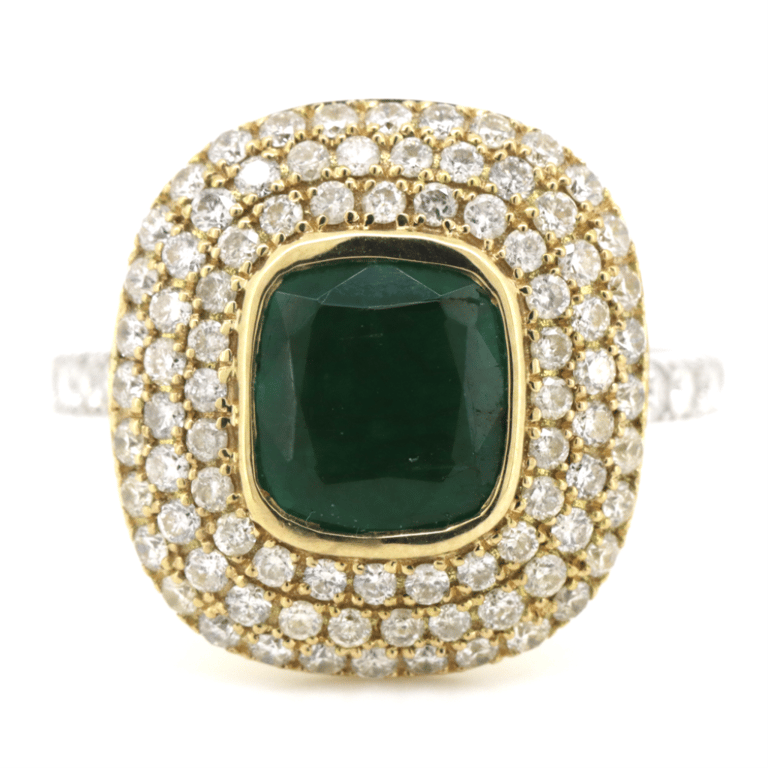 14K WHITE/YELLOW GOLD, EMERALD AND DIAMOND, HALO COCKTAIL RING. The Centre Design Features, One Cushion Cut, Dark Blue/Green, Emerald (1.65Ct, Slightly Included), Bezel Set In Yellow Gold. Encompassing The Design Are, 100 Round Brilliant Cut, Diamonds (1.08Ct Tdw, G-H Colour, Si1-Si2 Clarity), Micro-Claw Set In White/Yellow Gold. Ring Size M 1/2. Valuations Provided by an Independent Third-Party Professional Not Directly Associated With Lloyds Auctions at AUD $$27,000.00This valuation has been conducted by an independent third-party professional. The valuation amount is an assessment by the issuing valuer and does not reflect the auction value of the item. Any inquiries regarding the valuation should be directed to the issuing valuer (refer to contact details on the certificate), as Lloyds Auctions has no affiliation or influence over the valuation, the valuer, or the stated amount. Condition: Good - Refer Images 0645844+5094