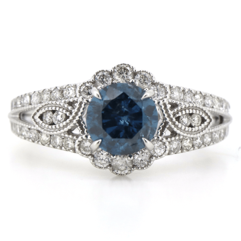 14K WHITE GOLD, FANCY BLUE DIAMOND, HALO FILIGREE RING.