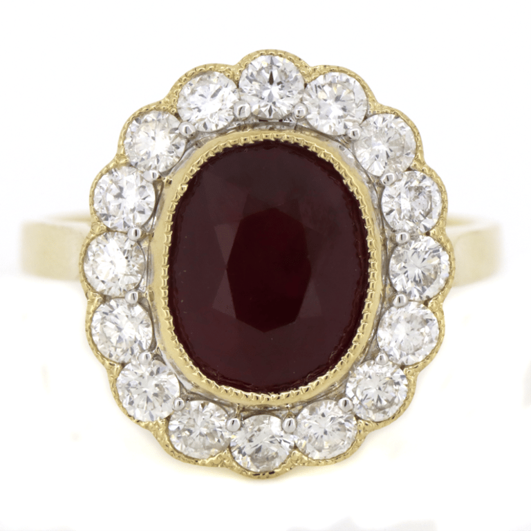The Centre Features, One Oval Cut, Ruby (4.49Ct, Moderate Natural Inclusions), Bezel Set With Millegrain Detail. Surrounding The Centre Are, 16 Round Brilliant Cut, Diamonds (1.16Ct Tdw, G-H Colour, Si1-2 Clarity), Semi-Bezel/Bead Set With Millegrain Detail. Ring Size P.