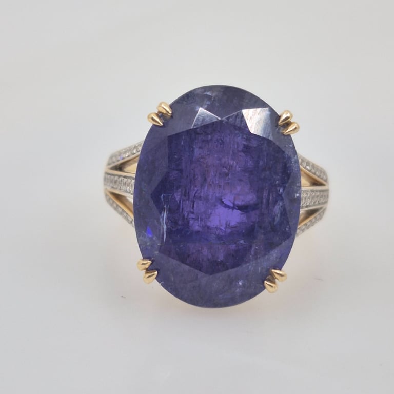One 16.91Ct Tanzanite, 17.85Mm X 13.30Mm X 8.50Mm *Estimated Whilst Set, Colour - Purplish-Blue, Tone - Medium Dark, Clarity - Moderate Eye Visible Inclusions, Oval Cut, Double Claw Set, Flanked By Fifty-Eight Round Brilliant Cut Diamonds, 0.18Ct Tdw, 1.00Mm Diameter (Average) Estimated Whilst Set, Colour-J-K, Clarity-S1-2-1-2, Micro-Claw Set In White Gold.