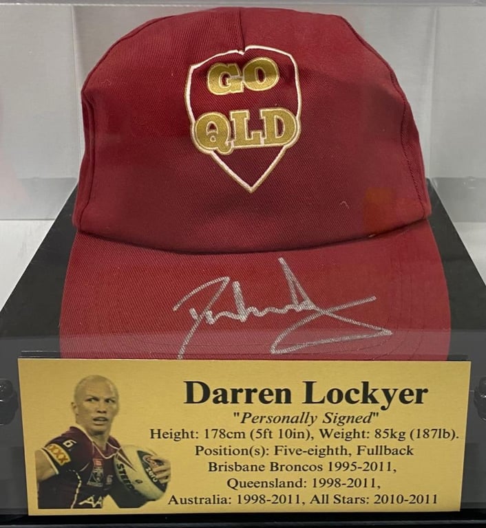 DARREN LOCKYER PERSONALLY SIGNED QUEENSLAND CAP The Cap Is Presented In A Perspex Display Case. Hand Signed By Darren Lockyer Using A Silver Marker Accompanied By A Certificate Of AuthenticityCondition: Good - Refer To Images488263+18