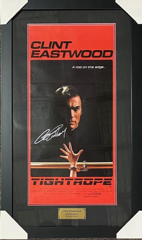 TIGHTROPE MOVIE POSTER, HAND SIGNED BY CLINT EASTWOODFramed Using Double Mats And A Plaque. Hand Signed By Clint Eastwood Using A Silver Marker. Accompanied By A Certificate Of AuthenticityCondition: Good - Refer To Images488263+14