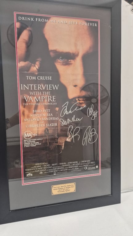 VAMPIRE MOVIE POSTER SIGNED BY: TOM CRUISE BRAD PITT STEPHEN REA ANTONIO BANDERAS CHRISTIAN SLATER HAS CERTIFICATE OF AUTHENTICITY Item Size: Height: 87cm, Width: 51cm Condition: Good - Refer To Images LOCATED RACK 12B 586142+5