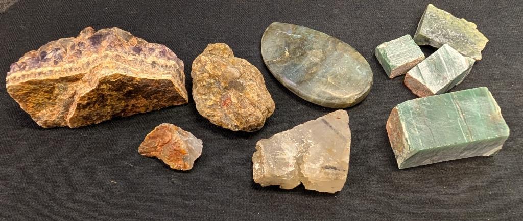 MIXED AUSTRALIAN GEM STONES, 213CT ZIRCON ROUGHS, 321CT AUSTRALIAN JADE/CHRYSOPRASE, 16G WA AMETHYST, 65G MOONSTONE AND QUARTZ.