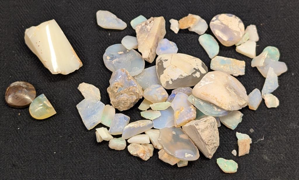 61CT OPAL PARCEL33ct Boulder Opal cab, Lightening Ridge and Coober Pedy roughs. 28ct Coober Pedy roughs with flashes.