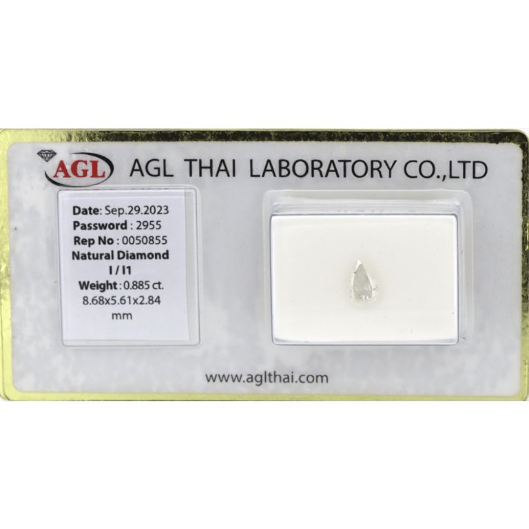 0.885CT CERTIFIED, NATURAL DIAMOND. Pear Brilliant Cut, I Colour, I1 Clarity, Loose, Unset. Stone Comes With Agl Report: 0050855. Valuations Provided by an Independent Third-Party Professional Not Directly Associated With Lloyds Auctions at AUD $$8,500.00This valuation has been conducted by an independent third-party professional. The valuation amount is an assessment by the issuing valuer and does not reflect the auction value of the item. Any inquiries regarding the valuation should be directed to the issuing valuer (refer to contact details on the certificate), as Lloyds Auctions has no affiliation or influence over the valuation, the valuer, or the stated amount. Condition: Good - Refer Images 0645846+2225
