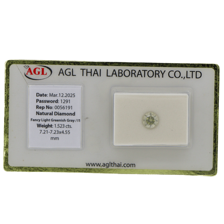 1.523CT CERTIFIED, NATURAL GREEN/GREY DIAMOND. Round Brilliant Cut, Fancy Light Greenish-Grey Colour, I1 Clarity, Loose, Unset. Stone Comes Sealed With Agl Report: 0056191. Valuations Provided by an Independent Third-Party Professional Not Directly Associated With Lloyds Auctions at AUD $$12,000.00This valuation has been conducted by an independent third-party professional. The valuation amount is an assessment by the issuing valuer and does not reflect the auction value of the item. Any inquiries regarding the valuation should be directed to the issuing valuer (refer to contact details on the certificate), as Lloyds Auctions has no affiliation or influence over the valuation, the valuer, or the stated amount. Condition: Good - Refer Images 0645846+2206