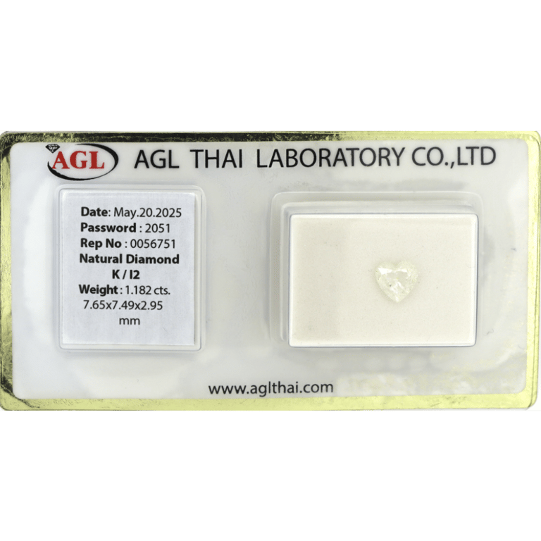 1.182CT CERTIFIED, NATURAL DIAMOND. Heart Brilliant Cut, K Colour, I2 Clarity, Loose, Unset. Stone Comes Sealed With Agl Report: 0056751. Valuations Provided by an Independent Third-Party Professional Not Directly Associated With Lloyds Auctions at AUD $$15,000.00This valuation has been conducted by an independent third-party professional. The valuation amount is an assessment by the issuing valuer and does not reflect the auction value of the item. Any inquiries regarding the valuation should be directed to the issuing valuer (refer to contact details on the certificate), as Lloyds Auctions has no affiliation or influence over the valuation, the valuer, or the stated amount. Condition: Good - Refer Images 0645846+2262