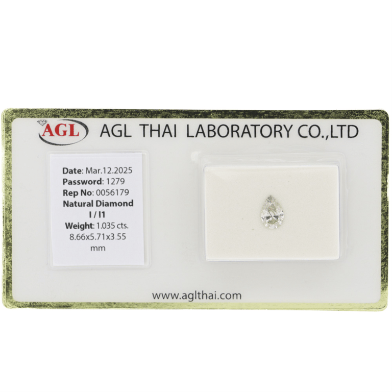 1.035CT CERTIFIED, NATURAL DIAMOND. Pear Brilliant Cut, I Colour, I1 Clarity, Loose, Unset. Stone Comes Sealed With Agl Report: 0056179. Valuations Provided by an Independent Third-Party Professional Not Directly Associated With Lloyds Auctions at AUD $$12,000.00This valuation has been conducted by an independent third-party professional. The valuation amount is an assessment by the issuing valuer and does not reflect the auction value of the item. Any inquiries regarding the valuation should be directed to the issuing valuer (refer to contact details on the certificate), as Lloyds Auctions has no affiliation or influence over the valuation, the valuer, or the stated amount. Condition: Good - Refer Images 0645846+2272