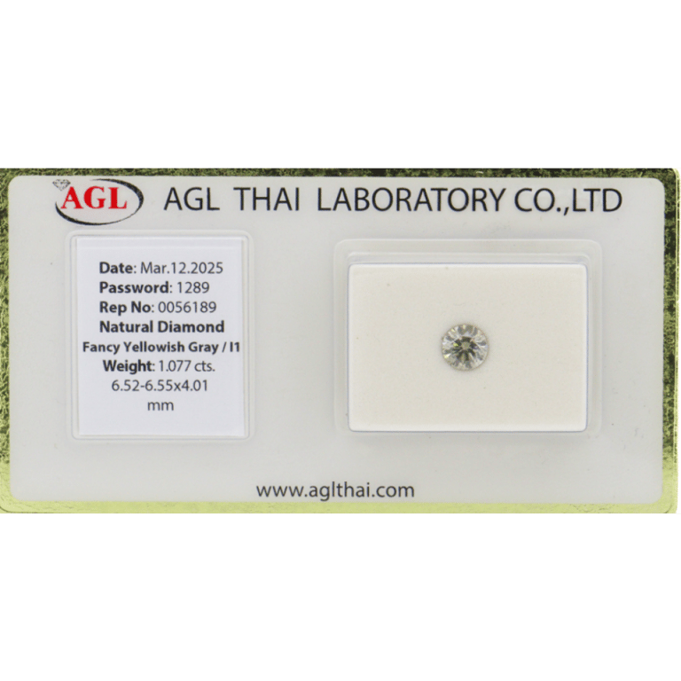 1.077CT CERTIFIED, NATURAL FANCY YELLOW/GREY DIAMOND. Round Brilliant Cut, Fancy Light Yellowish-Grey Colour, I1 Clarity, Loose, Unset. Stone Comes Sealed With Agl Report: 0056189. Valuations Provided by an Independent Third-Party Professional Not Directly Associated With Lloyds Auctions at AUD $$7,000.00This valuation has been conducted by an independent third-party professional. The valuation amount is an assessment by the issuing valuer and does not reflect the auction value of the item. Any inquiries regarding the valuation should be directed to the issuing valuer (refer to contact details on the certificate), as Lloyds Auctions has no affiliation or influence over the valuation, the valuer, or the stated amount. Condition: Good - Refer Images 0645846+2201