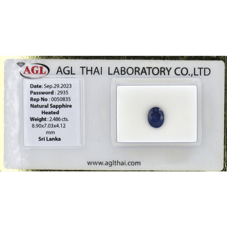 2.486CT CERTIFIED, NATURAL BLUE CEYLON SAPPHIR. Oval Cut, Medium Dark Blue, Minor Eye Visible Inclusions, Indication Of Heat Treatment, Ceylon (Sri Lanka) Origin, Loose, Unset. Stone Comes Sealed With Agl Report: 0050835. Valuations Provided by an Independent Third-Party Professional Not Directly Associated With Lloyds Auctions at AUD $$4,190.00This valuation has been conducted by an independent third-party professional. The valuation amount is an assessment by the issuing valuer and does not reflect the auction value of the item. Any inquiries regarding the valuation should be directed to the issuing valuer (refer to contact details on the certificate), as Lloyds Auctions has no affiliation or influence over the valuation, the valuer, or the stated amount. Condition: Good - Refer Images 0645846+2260