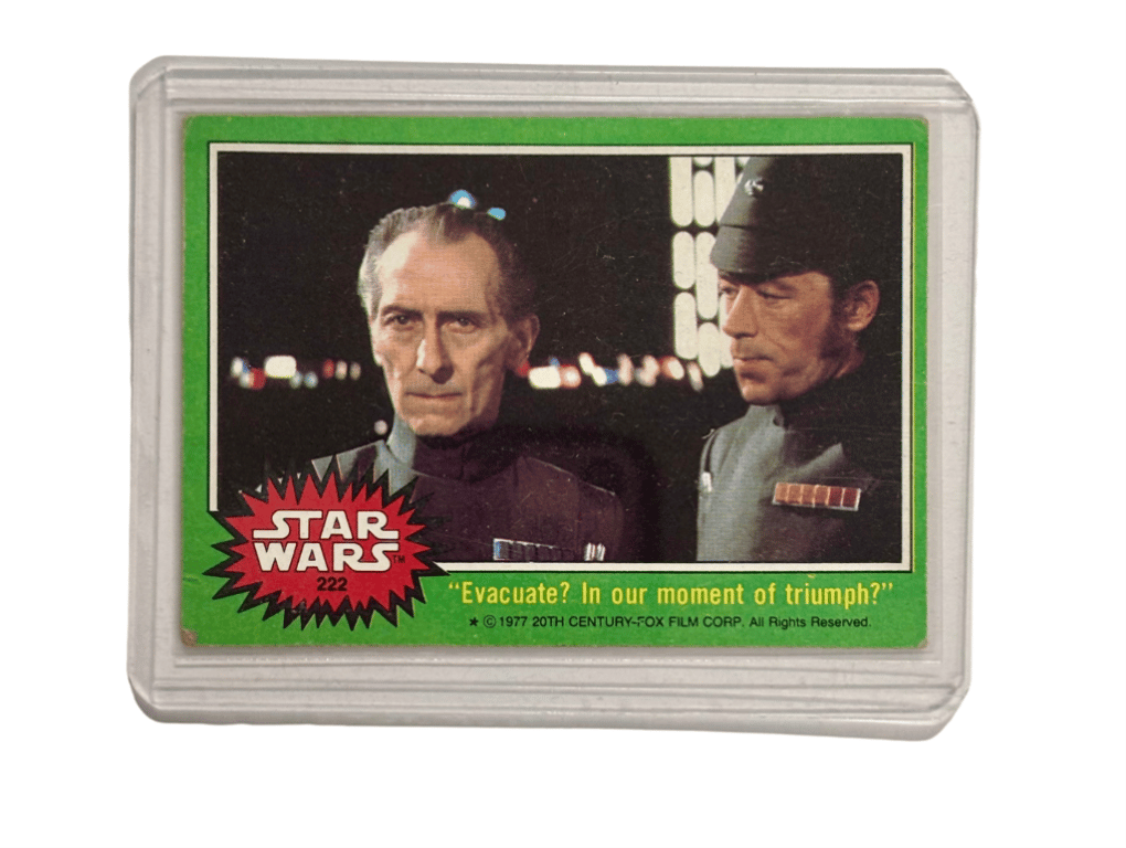 1977 TOPPS STAR WARS #222 – “EVACUATE? IN OUR MOMENT OF TRIUMPH?”Original 1977 Star Wars Card (#222) From The Green-Bordered Series. Features Iconic Quote From Grand Moff Tarkin In A Pivotal Scene Aboard The Death Star.- 1977 Topps Star Wars Green Series- Card #222- Iconic Quote: “Evacuate? In Our Moment Of Triumph?”- Excellent Collectible ConditionSize: Condition: Good - Refer To Images+47