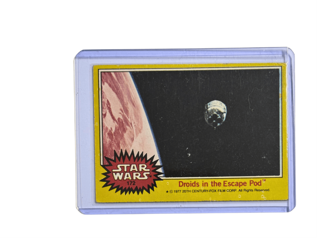 1977 STAR WARS #172 – “DROIDS IN THE ESCAPE POD” – YELLOW BORDER Card #172 From The Yellow-Border Series Of 1977 Star Wars Topps Cards. Shows The Iconic Escape Pod Scene As C-3Po And R2-D2 Flee The Empire. A Key Moment From The Opening Act Of The Film. - 1977 Topps Star Wars Card #172 - Yellow Border - Scene: Escape Pod Jettisons From Rebel Ship Size: Condition: Good - Refer To Images +61