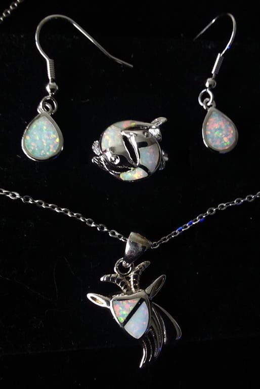 925 SILVER PENDANT NECKLACE DROP EARRINGS AND RING WITH WHITE LAB CREATED FIRE OPAL Condition: Good refer to images 0162884+31