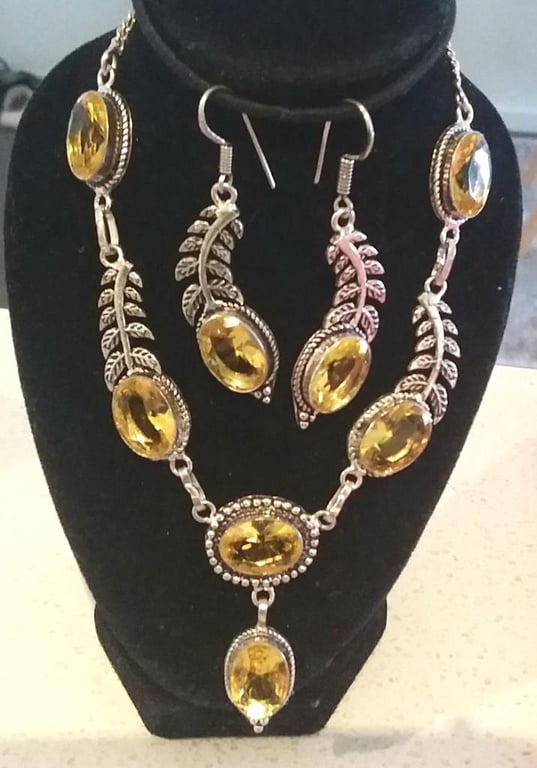 925 SILVER NECKLACE AND DROP EARRINGS WITH CITRINE CRYSTALS IN A LEAF SETTING Condition: Good refer to images 0162884+34