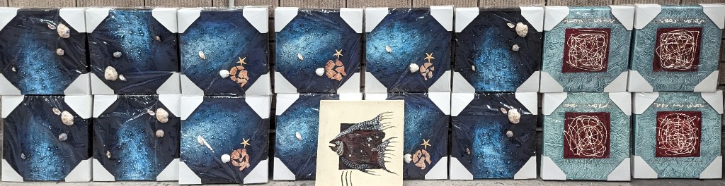 SEVENTEEN MIXED MEDIA ARTWORKS ON CANVASItem Size: Height: 30cm, Width: 30cmArtworks Include Oil Paint And Seashell Artwork, Ocean And Fish Themed ArtworkCondition: Good - Refer To Images584844+46
