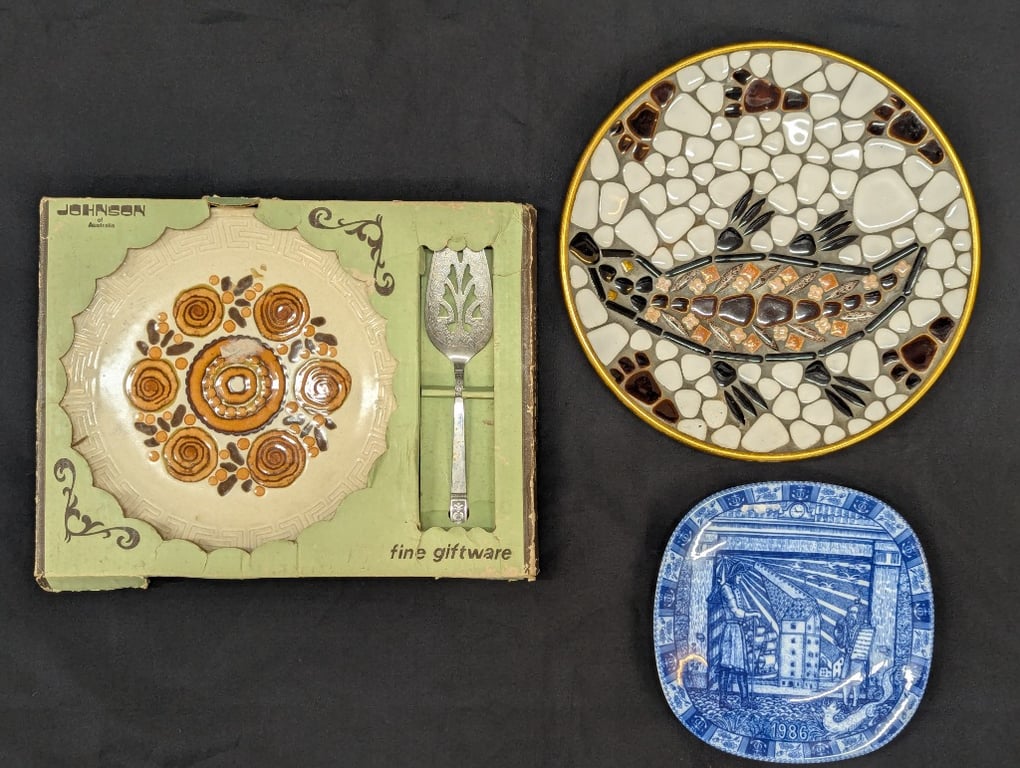THREE DECORATIVE PLATESIncludes: 'Rorstrands Jultallrik 1986' Decorative Plate, Blue Colour, Plate Diameter: 20Cm,Mosaic Style Plate With Platypus Style Design, Ring On Plate Base To Hang, Plate Diameter: 30CmJohnson Fine Giftware Plate And Cake Server Set, Plate Features Ceramic Style Design With Spiral Imagery In CentreCondition: Good - Refer To Images584867+9