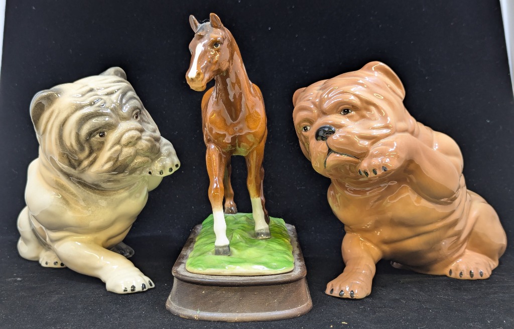 THREE ANIMAL STATUES Statues Include Horse On Glass And Two Dogs, Horse Statue Feature Bay Horse On Green Grass With Timber Base (Size Approx: 22Cm H X 11Cm W X 25Cm D), Two Matching Dog Statues With Differing Colours (Size Approx: 17Cm H X 13Cm W X 24Cm D) Condition: Good - Refer To Images 584862+1
