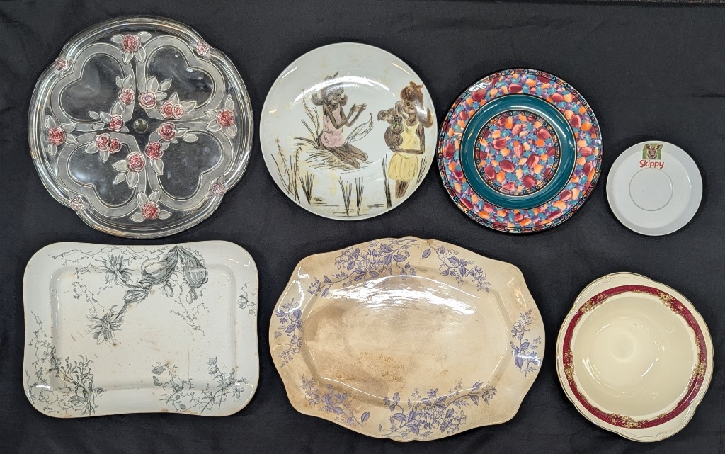 COLLECTION OF DECORATIVE PLATES AND SERVING TRAYS Includes Glass Plate With Rose Style Designs (Diameter: 34Cm), Skippy The Kangaroo Plate, Two Serving Trays With Floral Patterns, Australian Native Art Decorative Plate, Etc Condition: Good - Refer To Images 584862+6