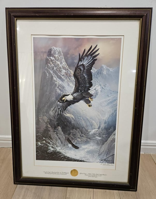 Framed Print, This collectible print is an original work of art signed by the artist, Ted Blaylock. It is titled, “Save the Eagle, Proud and Free”. Issued exclusively by The Franklin Mint, it comes with a Certificate of Authenticity authorized by the Alaska Chilkat Bald Eagle Preserve and the Alaska State Parks. Left side of the bottom reads, “Save the Eagle, Proud and Free” by Ted Blaylock