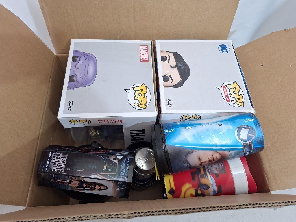 COLLECTABLES: 1 x FUNKO Vinyl Soda "Dr Fate" Figure, 1 x FUNKO Vinyl Soda "Superman", 1 x FUNKO Vinyl Soda "Martian Manhunter" Figure, 1 x FUNKO Vinyl Soda " The Flash" figure, 1 x FUNKO Vinyl Soda " Batman Beyond" figure, 1 x FUNKO vinyl figure 'THANOS' 10inch vinyl bobble-head 308, 1x FUNKO vinyl figure 'SUPERMAN' 10inch figurine 159, Collectable popcorn holders, drink bottles, moneybox, games and The Lord Of The Rings Pin Collection, Bag Full Of Rubber Ooshies