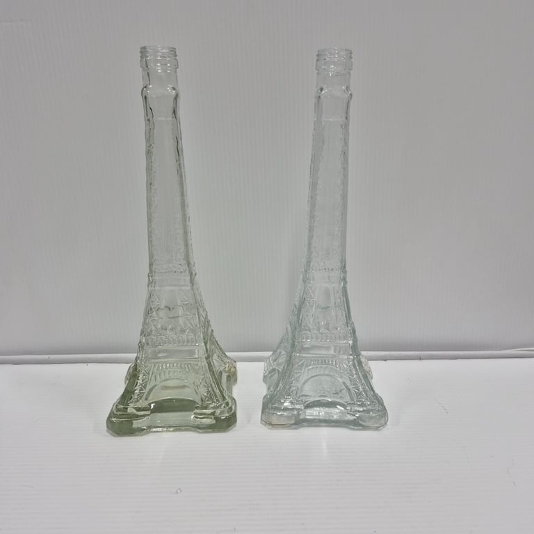 2 VINTAGE GLASS BOTTLES SHAPED LIKE THE EIFFEL TOWER