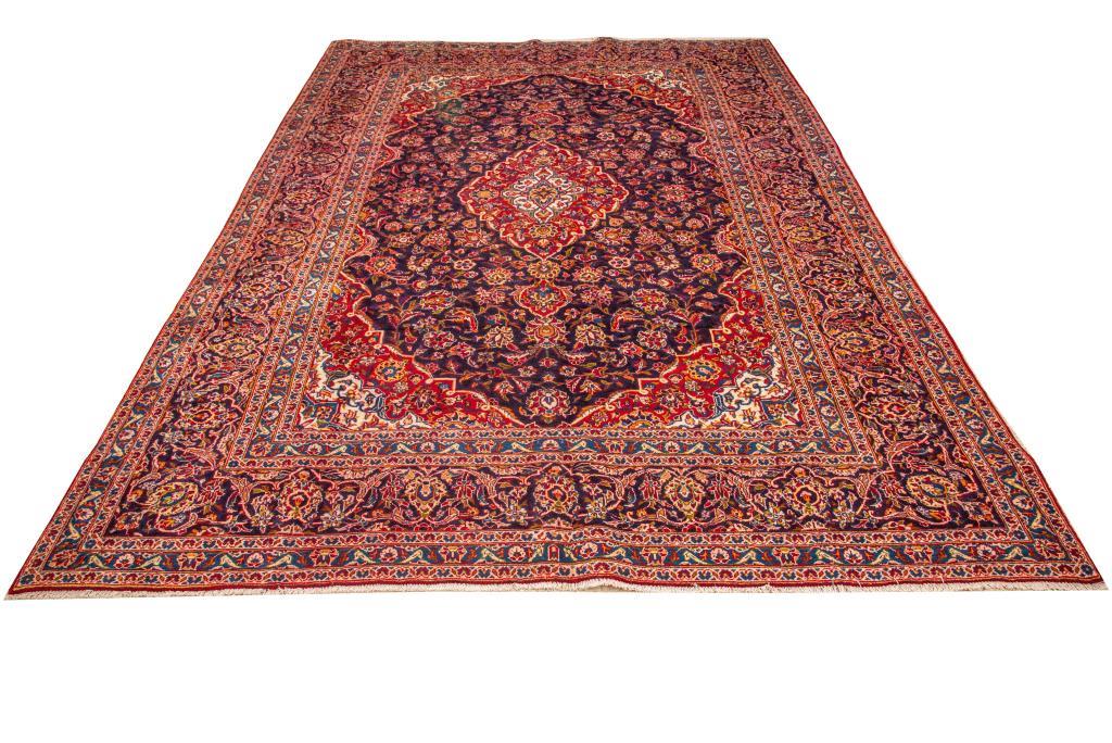 100% Lambs Wool Polished Pile, Very Solid And Densely Hand Knotted. In A Traditional Design Of A Central Medallion In Soft Tones Of Navy. Sha Abbasi Palmettes In Tones Of Persian Blue With Red Border. Origin: Persia.Sizecm): 373X273 Circa 1980S Rrp: $6800