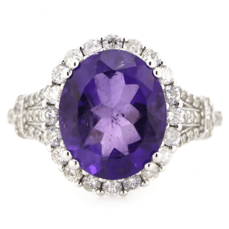14K White Gold, Amethyst And Diamond, Halo Ring. The Centre Features, One Oval Cut, Medium Purple, Amethyst (4.05Ct, Eye Clean Clarity), Double 4 Claw Set. Surrounding The Centre In A Halo And Decorating The Setting Are, 64 Round Brilliant Cut, Diamonds (0.81Ct Tdw, J-K Colour, Si2-I2 Clarity), Bead/Claw Set. Ring Size O.