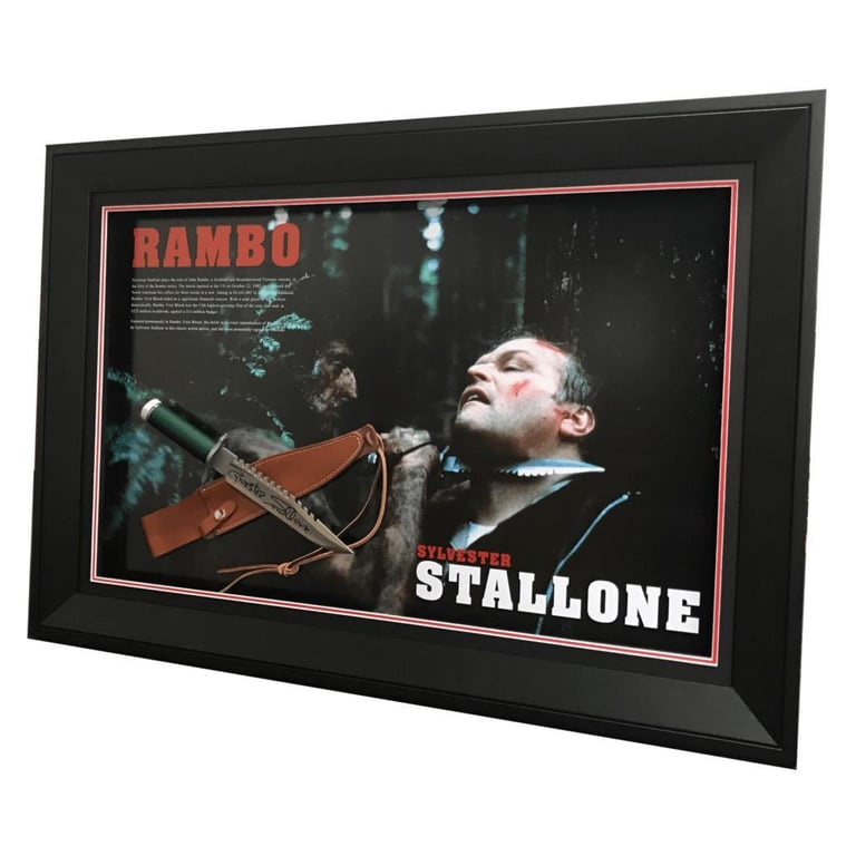 SYLVESTER STALLONE SIGNED ‘RAMBO’ KNIFE FRAMED WITH PHOT0 PROOFSylvester Stallone Has Established Worldwide Recognition As An Actor, Writer And Director Since He Played The Title Role In His Own Screenplay Of Rocky, Which Won The Academy Award In 1976 For Best Picture. Rocky Grew To A Franchise Of Five Sequels And In 2006 Stallone Concluded The Series With Rocky Balboa, A Critical And Audience Success Which Resolutely Confirmed Both Stallone And Rocky As Iconic Cultural Symbols. In More Recent Times, Stallone Wrote, Directed And Starred In Rambo, Which Continued The Saga Of Vietnam Vet John Rambo Twenty Five Years After The Debut Of Rambo: First Blood. Stallone Then Released His A Most Ambitious Project , The Action Thriller The Expendables, Which He Has Wrote, Directed And Starred In. This Makes Sylvester Stallone The Only Actor To Open A Number One Film Across Five Decades.To Celebrate The Second Rambo Movie That Continued The Legend Of John Rambo. Each John Rambo Knife Measures 15.5′ In Overall Length . Features A Top Quality 420 Stainless Steel Blade With Slotted Saw Teeth, A Hollow Handle With Survival Kit, Aluminium Butt Cap With Precision Compass And A Double Screwdriver Guard. This Museum Quality Replica Has Been Hand Crafted With Pride From The Finest Materials Available And Comes Complete With A Top Grain Leather Sheath. Specifications:15 1/2′ Overall Length, Top Quality 420 Stainless Steel 1/4′ Thick Blade With Centre Slotted Saw Teeth And Matte Black Finish. Hollow Handle Wrapped In Heavy Black Nylon Cord With Waterproof O Ring And Survival Kit, Stainless Steel Guard With Lashing Holes, Non-Magnetic Aluminium Butt-Cap With Precision Compass And Lanyard Hole, Phillips And Standard Screwdriver Points, Quality Top Grain Genuine Leather Sheath With Leg Tie, Officially Licensed Reproduction By Master Cutlery.Stallone Has Personally Signed The Replica Knife During A Private Signing Session. You Will Also Receive A Photo Of Stallone Signing The Item And A Certificate Of Authenticity From Icons Of Sport.Condition: Good - Refer To Images488273+33353