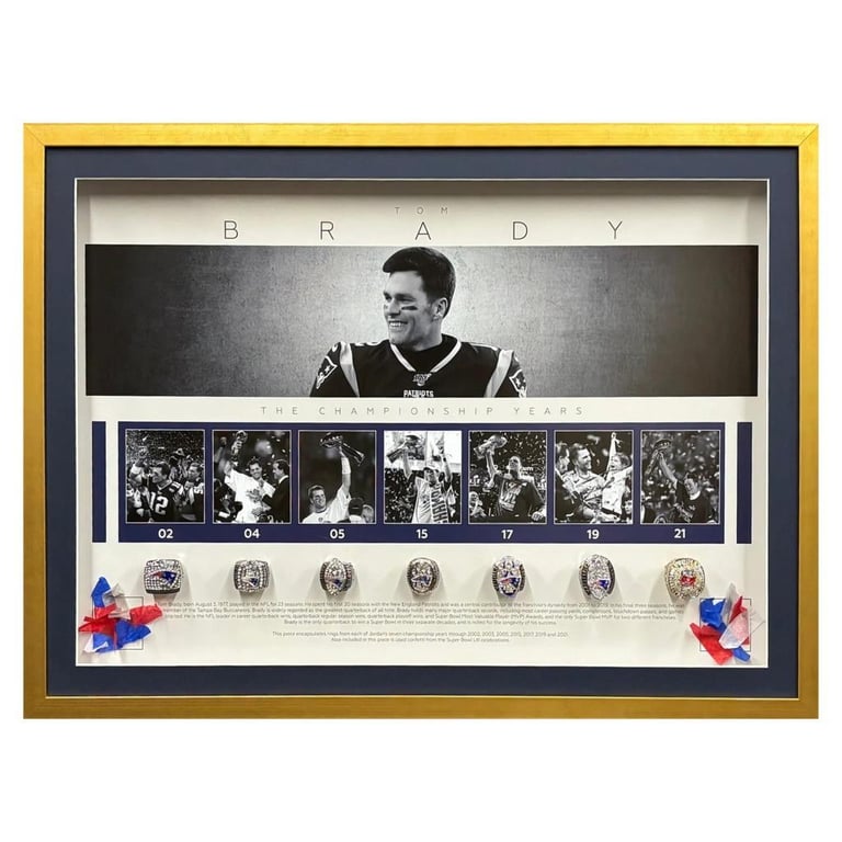 TOM BRADY CHAMPIONSHIP REPLICA RING DISPLAY W/ AUTHENTIC CONFETTI FROM BRADY’S FINAL CHAMPIONSHIPSeven Full-Size Replica Super Bowl Rings (2002, 2004, 2005, 2015, 2017, 2019, 2021)Iconic Black-And-White Image Of Tom Brady, Showcasing His Leadership And LegacySuper Bowl-Winning Photographs From Each Championship Year, Capturing Historic MomentsAuthentic Confetti From Brady’S Final Championship Win In 2021, Officially Released By FanaticsTimber Gold Frame With A Navy-Blue Border, Providing A Premium And Elegant DisplayPerfect For An Office, Sports Room, Man Cave, Or Memorabilia CollectionCondition: Good - Refer To Images488273+333131
