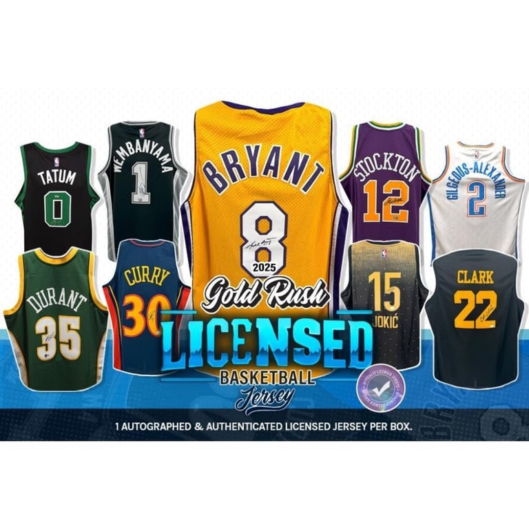 2025 GOLD RUSH AUTOGRAPHED LICENSED BASKETBALL JERSEY BOX1 Autographed Authenticated Jersey Per Box.Wrap Up A Memorable Basketball Season In Style With The 2025 Gold Rush Autographed Licensed Basketball Jersey Drop! Players Representing All 30 Nba Teams Make Up A Phenomenal 60-Player Checklist In This Series!Find Autographs From Prominent Hall Of Famers, Fan Favorites, Veteran All-Stars, And The League'S Most Thrilling Young Hoopers! Look Out For Special Inscriptions Like Player Catchphrases And Career Stats!Every Jersey In This Release Is Produced By A Major Brand, Like Adidas, Mitchell &Amp; Ness, Or Nike, And Features Your Favorite Team Names And Logos From Both The Nba And Wnba! Each Signature Has Been Authenticated By An Industry Professional Such As Beckett, Fanatics, Jsa, Or Psa.Chase Autographs From These Hardcourt Heroes:Kobe BryantCaitlin ClarkVictor WembanyamaZion WilliamsonJohn StocktonDwyane WadeJa Morant...And Many MoreCondition: Good - Refer To Images488273+33346