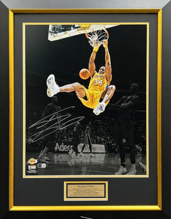 SHAQUILLE O'NEAL SIGNED LA LAKERS 16" X 20" PHOTO FRAMEDShaquille O’Neal Has Personally Signed This 16″ X 20″ Photo. The Photo Comes Professionally Framed. This Item Is 100% Authentic To Include A Certificate Of Authenticity (Coa) / Hologram By Beckett Authentication Services.Condition: Good - Refer To Images488273+33304