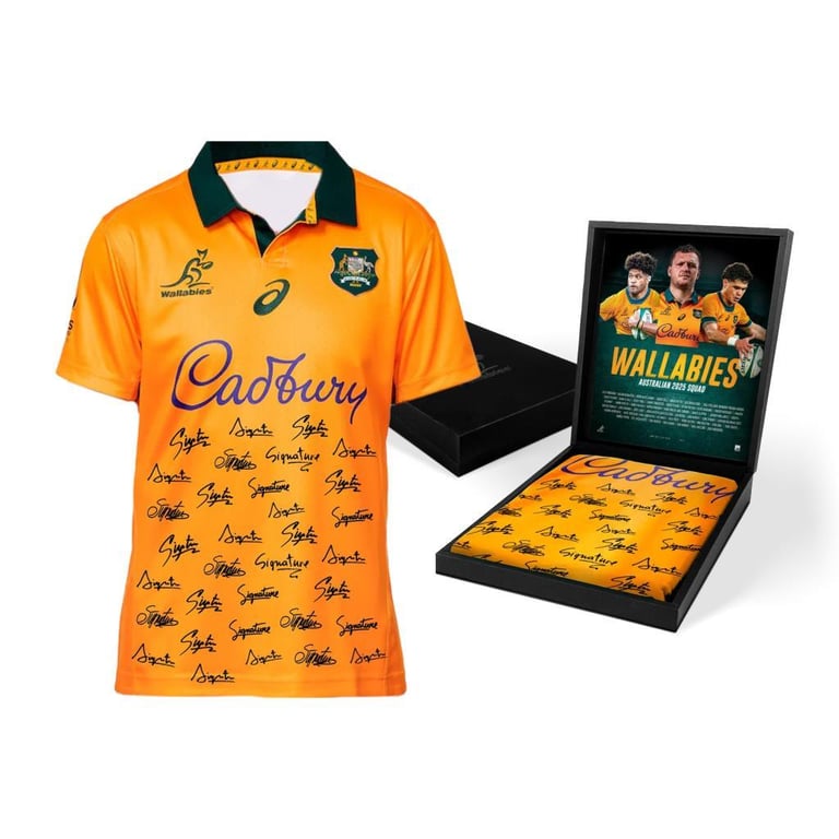 2025 WALLABIES SQUAD SIGNED JERSEY BOXEDAs The Wallabies Set Themselves To Take On The World, We Celebrate Their Quest For ‘Green And Gold Glory’. With A Point To Prove, And A Nation Who Will Be Behind Them Every Step Of The Way, The Wallabies Are A Young Side Filled With Talent, Passion, And A Desire For Glory. We’Re With You.The Ultimate Tribute To The Wallabies 2025 Squad, As They Represent Australia On The World StageFeatures An Officially Licensed 2025 Wallabies Jersey, Personally Signed By The Wallabies 2025 SquadStrictly Limited To Just 50 Editions Worldwide, With Each Edition Accompanied By A Certificate Of AuthenticityPresented In A Deluxe Presentation Box, Featuring A Specially Designed Insert Listing Squad MembersOfficially Licensed And Endorsed By Rugby AustraliaIndependently Authenticated By A-Tag, With Each Edition Including A Tamper-Proof, Uniquely Numbered Hologram Discreetly Affixed To The DisplayCondition: Good - Refer To Images488273+33383