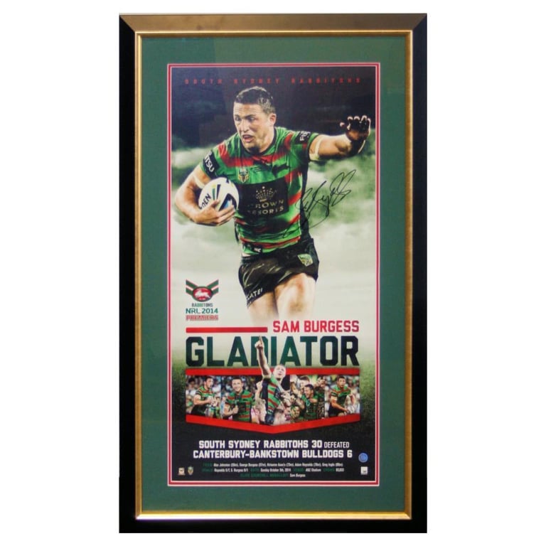 SIGNED SAM BURGESS FRAMED PRINT2014 South Sydney Rabbitohs Premiers Vertiramic – Personally Signed By Sam BurgessPays Tribute To The 2014 Nrl Premiership Won By The South Sydney RabbitohsPersonally Signed By Clive Churchill Medallist Sam BurgessPresented In A Deluxe Timber FrameOfficially Licensed By The National Rugby LeagueAccompanied By A Certificate Of AuthenticityAuthenticated By A-TagApproximate Framed Dimensions 860 X 410 MmCondition: Good - Refer To Images488273+33303