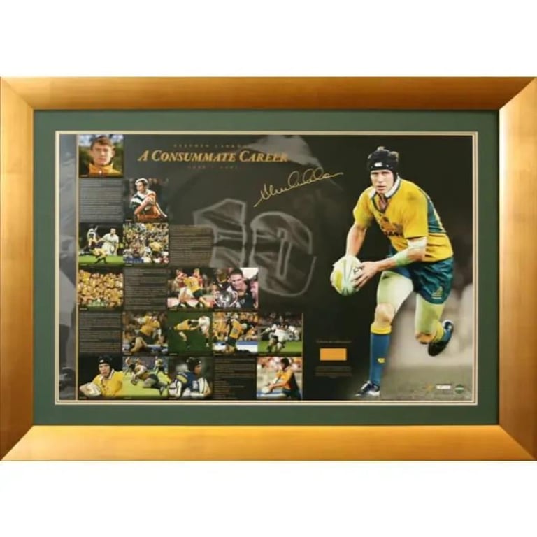 STEPHEN LARKHAM SIGNED “PIECE OF THE ACTION” PRINT FRAMEDStephen Larkham Was A Fixture In The Wallabies Side Since Way Back In 1996 Till He Retired In 2007 Playing In A Total Of 102 Test Matches.A Consummate Career Includes An Actual Swatch Of Stephen’S Game Worn Jersey Is Incorporated Into A Stunning Visual Tribute Of His Mighty Career Along With A Detailed Account Of His 12 Years In The Wallabies Team, And Is Signed By The Fearless Flyhalf Himself.The Print Has Also Been Personally Signed By Stephen Larkham And Is A Artist Proof From The Edition. Includes A Certificate Of Authenticity And A Icons Of Sport Hologram.Condition: Good - Refer To Images488273+333132