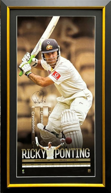 RICKY PONTING SIGNED LITHOGRAPH FRAMEDFeaturing An Action Photo Of Ricky Ponting At The Crease About To Take A Shot, The Photo Outlines His Impressive Stats At The Base. This Lithograph Is Exquisitely Framed And Is One Of The Best Ponting Memorabilia Pieces Around And Has Been Personally Signed By Ricky Ponting. Condition: Good - Refer To Images488273+333127