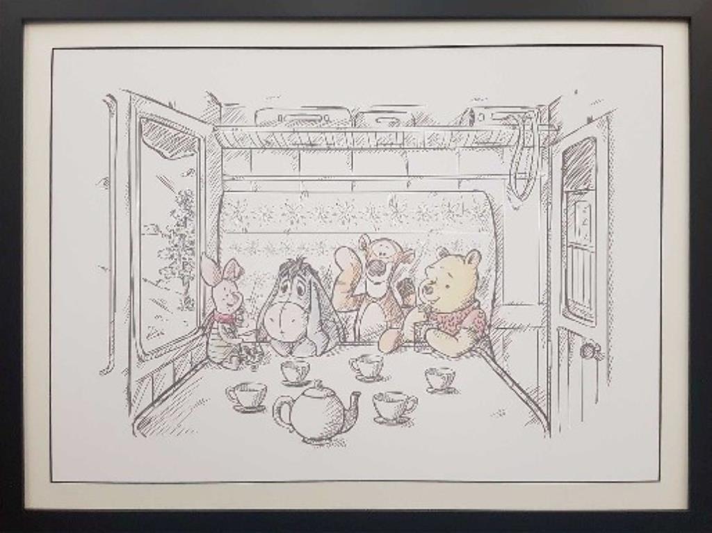 A Modern Print Licensed By Disney Featuring Winnie The Pooh, Piglet, Eeyore And Tigger All Sitting At The Table. Beautifully Framed With Black Frame And Black Core Matting