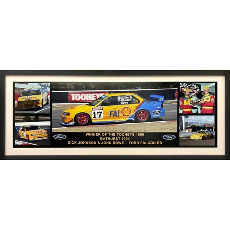 Licensed Panoramic Montage Featuring The 1994 Ford Falcon Eb Driven By Dick Johnson And John Bowe During The Bathurst 1000. Beautifully Framed With Timber Moulding And Acid Free Matboards.